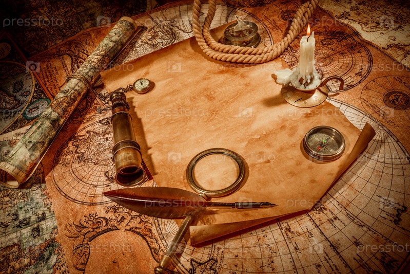 Винтажный натюрморт. Винтажные предметы на старинной карте. Путешествия и приключения в винтажном стиле