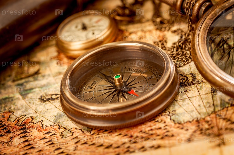 Путешествия и приключения в винтажном стиле. Винтажный старый компас и другие винтажные предметы на столе