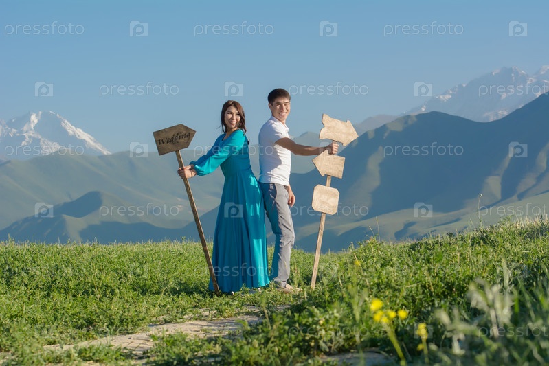 Парень и девушка азиатской национальности в поле на фоне гор с табличкой о свадьбе, и с пустыми табличками в руках для вашей подписи
