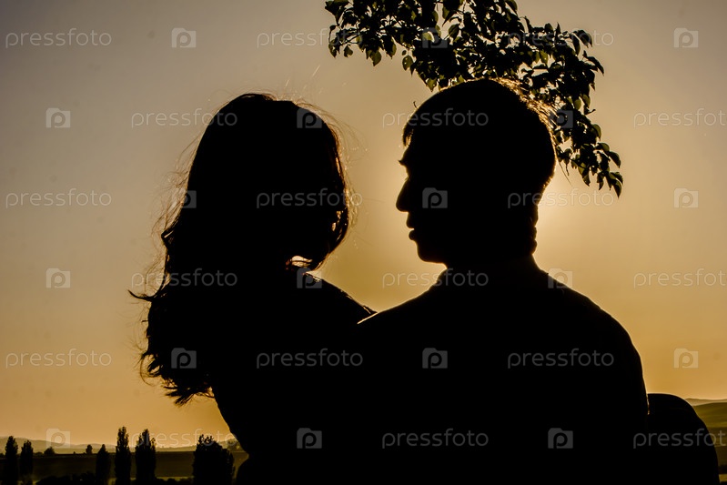 Девушка и парень на закате в горах напротив солнца в силуэте тел