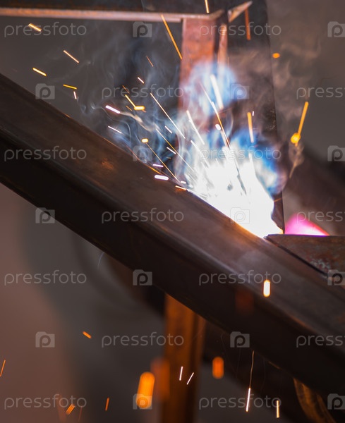 Процесс сварки металлических элементов со вспышками света и искрами
