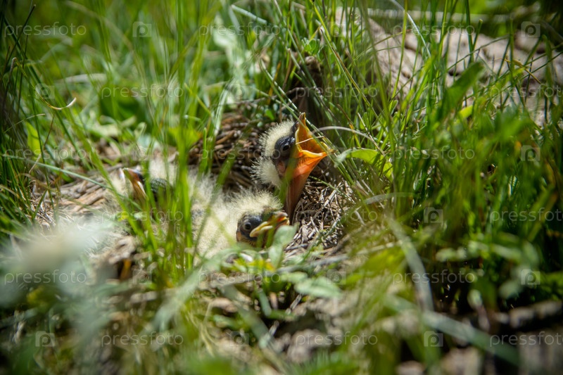 Птенцы в гнезде на земле среди травы ждут свою мать
