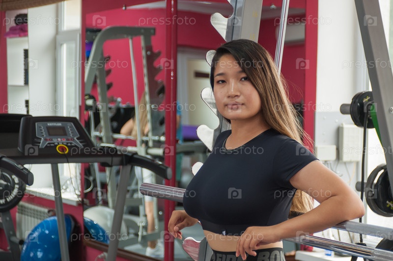 Азиатская девушка выполняет различные упражнения в спортзале