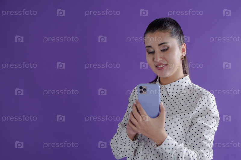 Девушка с телефоном позирует в студии