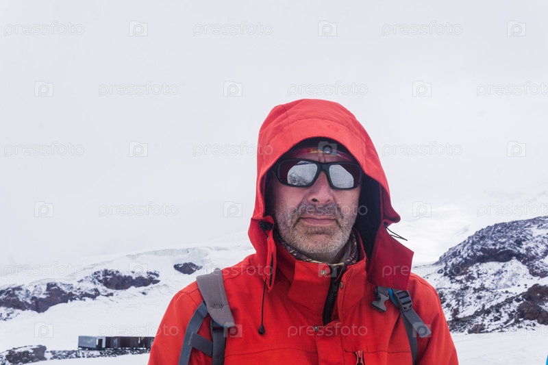 Портрет альпиниста на заснеженном склоне горы Эльбрус на пути к вершине. Эльбрус — высочайшая вершина Европы