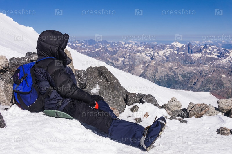 Альпинист отдыхает, сидя на заснеженном склоне среди скал в высокогорье
