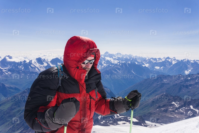 Мужчина-альпинист на заснеженном склоне горы Эльбрус на пути к вершине