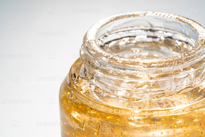 Баночка с прозрачным косметическим продуктом, 24-каратный золотой гель или крем на светлом фоне. Небрендированная упаковка с антиоксидантным кремом для ухода за собой. Закрыть