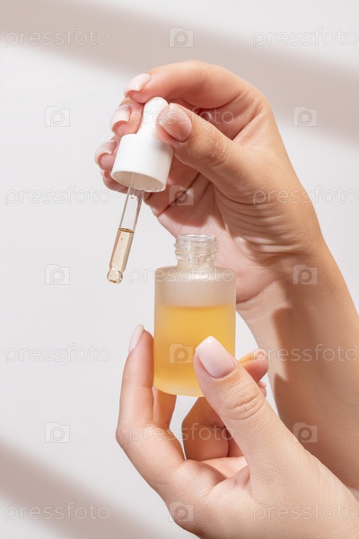 Женская рука с капельницей эфирного масла, ароматерапевтической эссенции, сыворотки красоты или лечебной жидкости на светлом фоне с тенями. Небрендированные бутылки для вашего дизайна