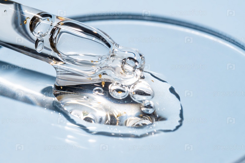Пипетки с косметическим гелем с золотыми частицами в чашке Петри на синем фоне. Лаборатория по уходу за кожей