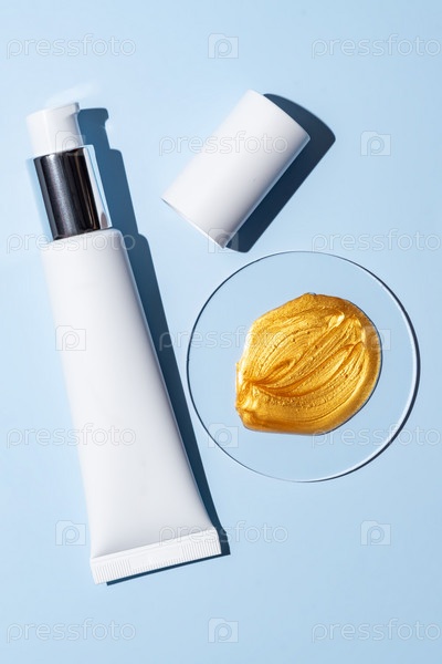 Макет белой помпы пластиковой трубки для брендинга лекарств или косметики. Косметический флакон-контейнер на синем фоне рядом с чашкой Петри с мазком золотой маски. Минимализм