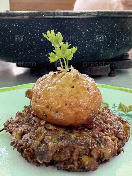 Запеченный картофель на грибной котлете. Украшен веточкой петрушки