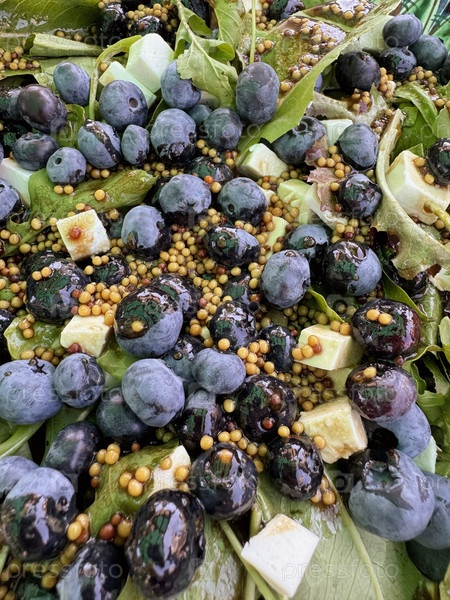 Летний салат с зеленью, сыром, французской горчицей и черникой