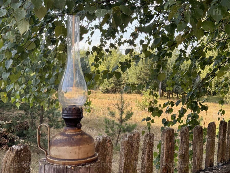Керосиновая лампа установлена на ветхом деревянном заборе. На фоне леса