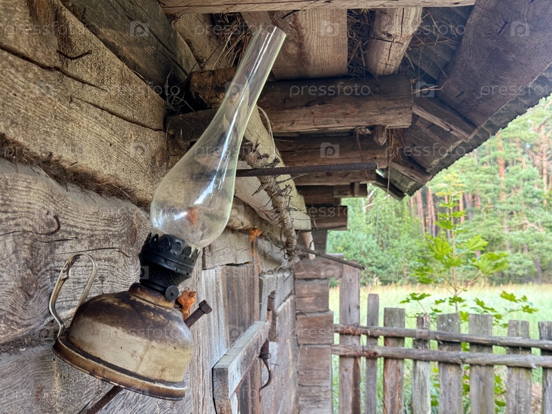 На стене старого бревенчатого сарая висит керосиновая лампа