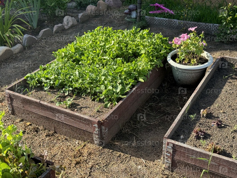 Небольшая грядка зелени. Грядка в деревянном ящике снаружи. Горшок с цветами