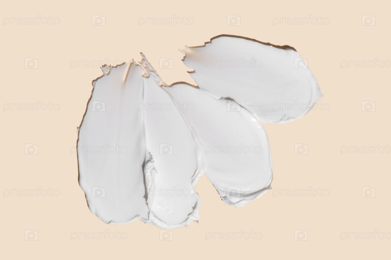 Кремообразные мазки белой косметической текстуры крупным планом на бежевом фоне концепция ухода за кожей