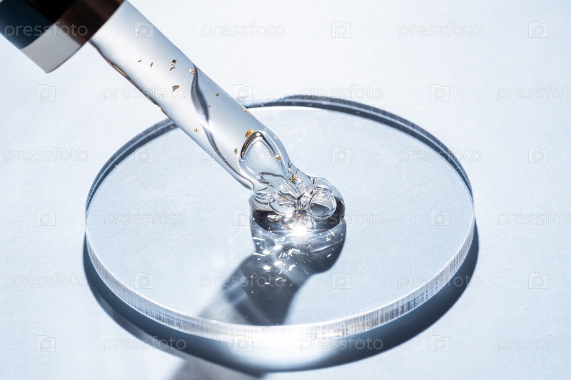 Пипетки с косметическим гелем с золотыми частицами в чашке Петри на синем фоне. Лаборатория по уходу за кожей
