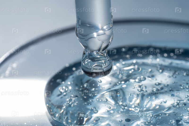 Крупный план пипетки с жидким гелем-сывороткой и тенями на синем фоне. Модная косметика, снятая с жесткими тенями