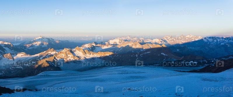 Рассветный панорамный вид на высокие горы над облаками с ледника на склоне Эльбруса
