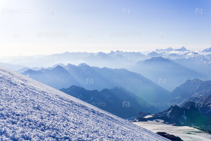 Вид с высокогорного ледника на туманные горы в лучах рассвета