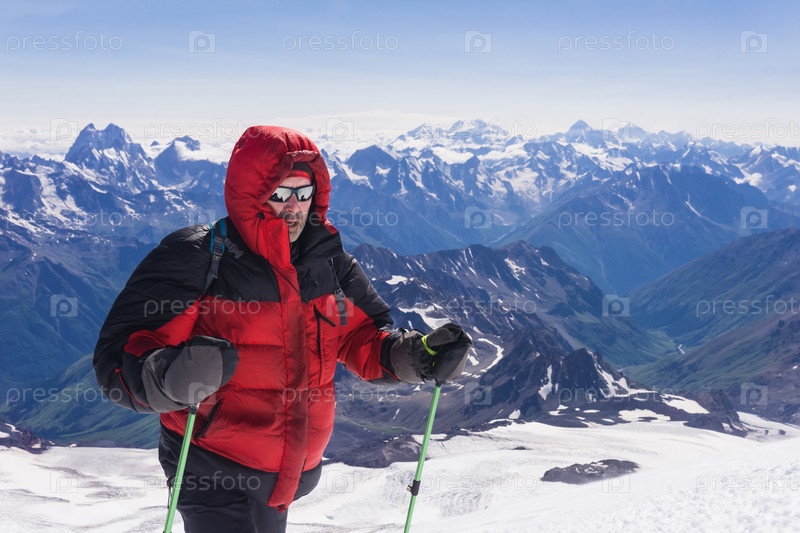 Альпинист на заснеженном склоне Эльбруса на пути к вершине