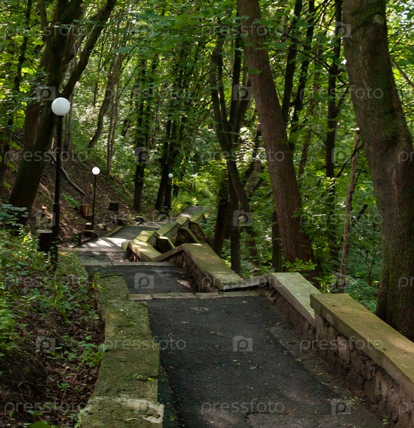 Тенистая каменная лестница на территории парка санатория им Горького ведет к улицам Карла Маркса и Вокзальная. г Кисловодск, Ставрапольский край, Россия