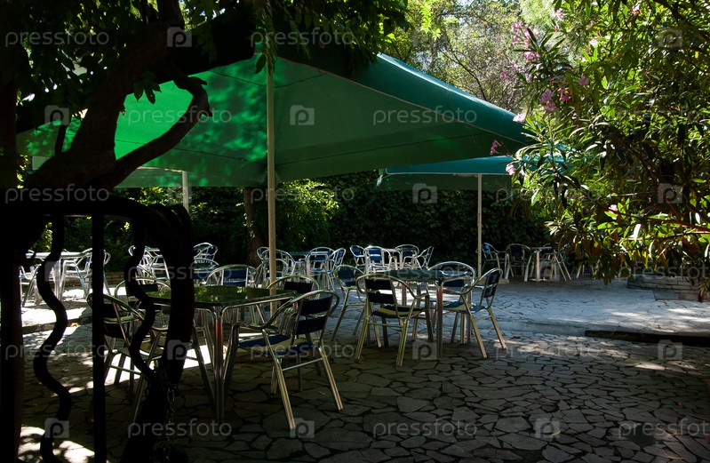 Столики под навесом, летнее кафе в тени цветущих магнолий. Крым, Россия
