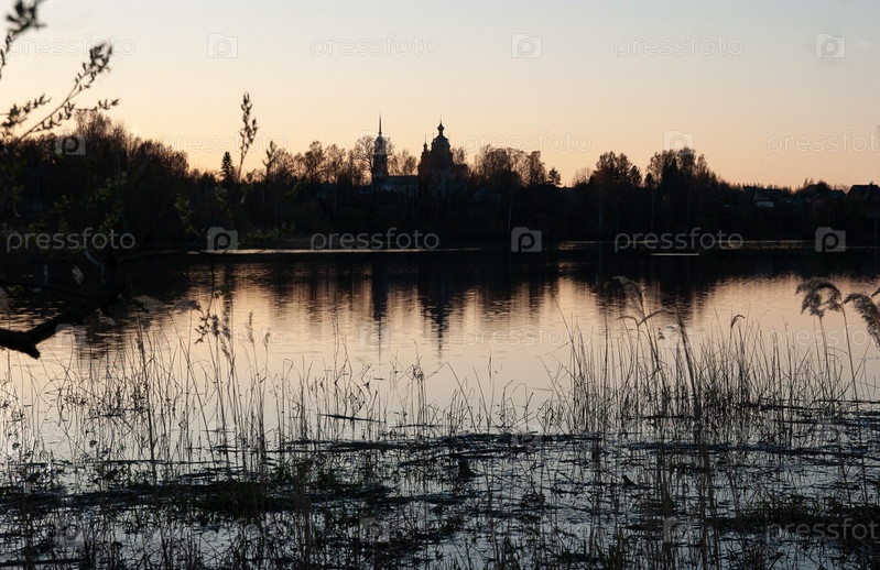 Ночная река Ильд тишина, камыши на другом берегу село Верхнее-Никульское и Троицкая церковь. Ярославская область, Россия