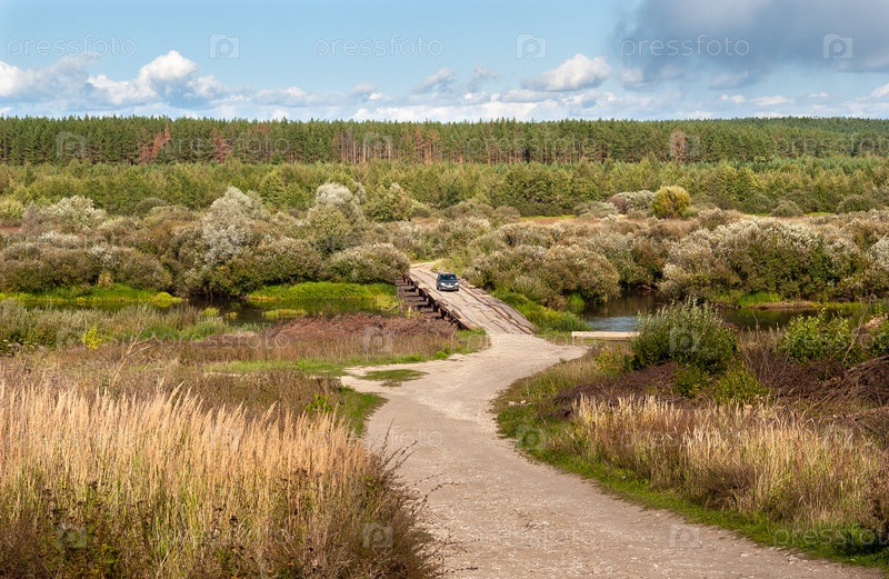Машина такси на деревянном мосту через реку Гусь. Село Погост, Рязанская область, Россия