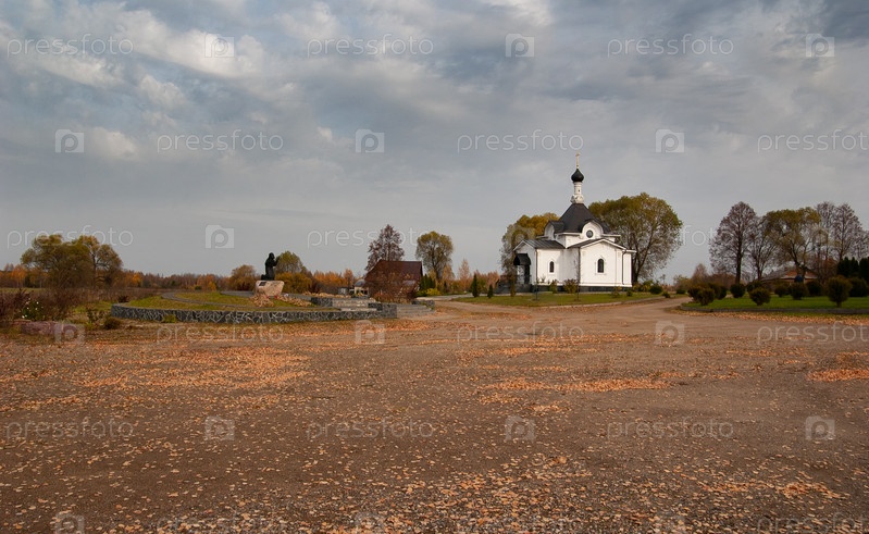 Церковь Иустиниана Царя (крестильная), с купелью в виде креста в центре храма. Образ Серафима Саровского в бронзе и камне. поселок Годеново, Ярославская область, Россия