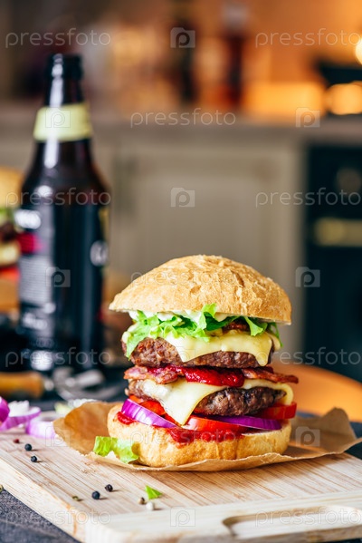 Чизбургер с бутылкой пива и некоторыми ингредиентами
