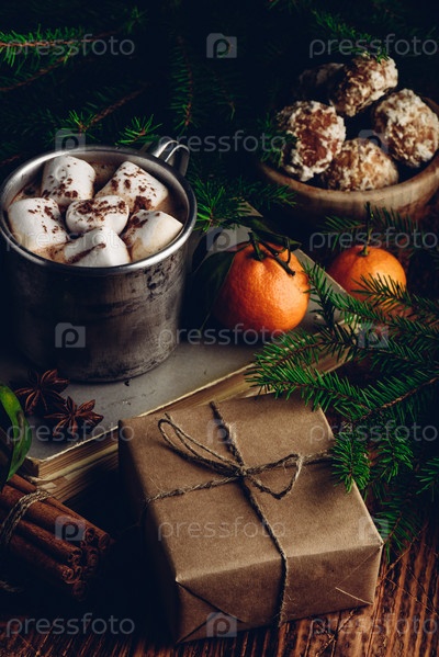 Подарочная коробка и горячий шоколад с зефиром