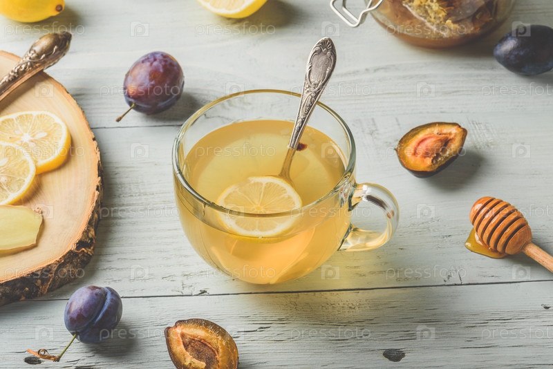 Чашка чая с лимоном, медом и имбирем