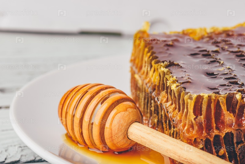 Соты на тарелке с ложкой для меда