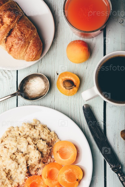 Каша с абрикосом, кофе, стакан сока и круассан