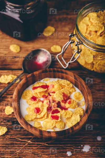 Завтрак с кукурузными хлопьями, молоком и ягодным сиропом