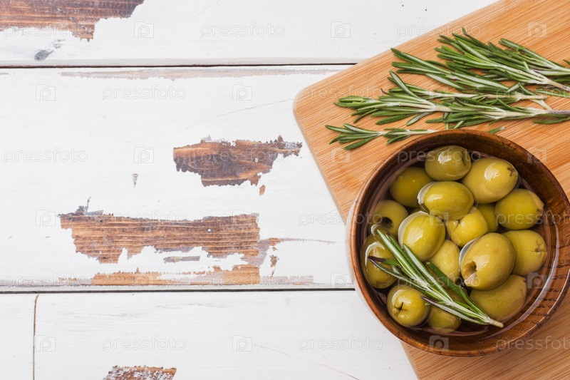 Зеленые оливки в деревянных мисках на деревянном столе. Вид сверху с местом для текста