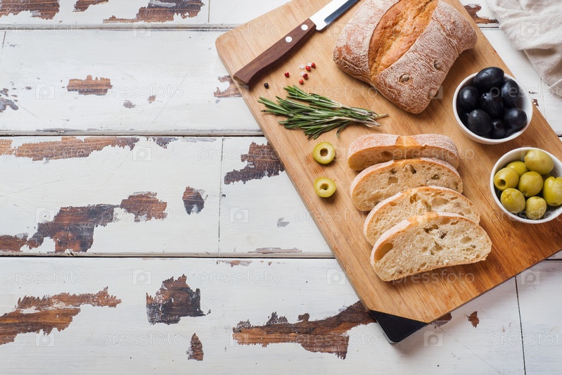 Итальянский хлеб чиабатта с оливками и розмарином на деревянной доске. Копировать пространство