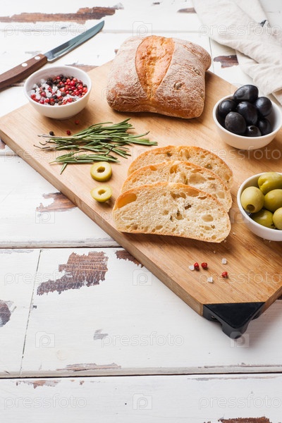 Итальянский хлеб чиабатта с оливками и розмарином на деревянной доске. Копировать пространство
