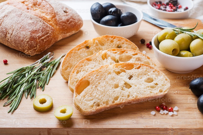 Итальянский хлеб чиабатта с оливками и розмарином на деревянной доске