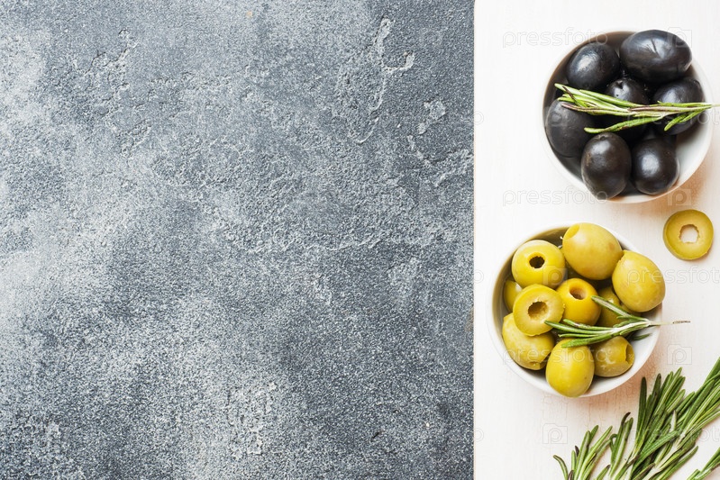 Черные и зеленые оливки в мисках на темном столе. Копировать пространство