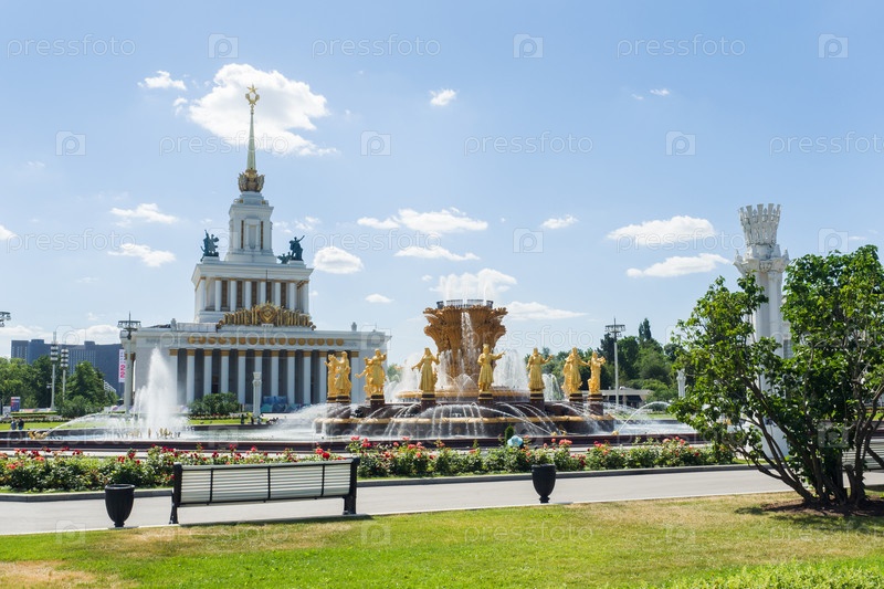 Москва, Россия - 24 июня 2019 г.: Вид на фонтан Дружбы народов и Центральный павильон на ВДНХ