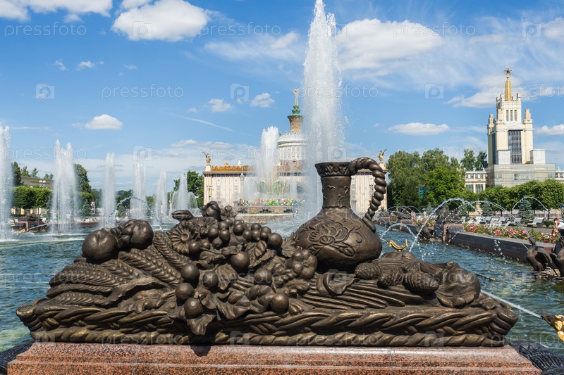 Москва, Россия - 24 июня 2019 г.: Скульптурные фонтаны в парке ВДНХ в Москве
