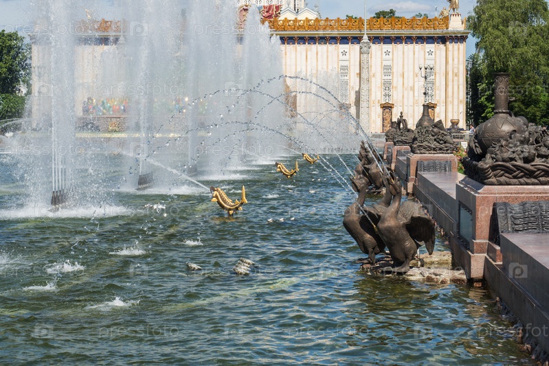 Москва, Россия - 24 июня 2019 г.: Скульптурные фонтаны в парке ВДНХ в Москве
