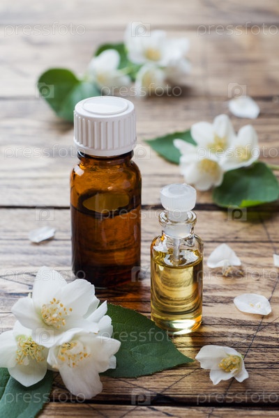 Масло жасмина. Ароматерапия с маслом жасмина. Цветы жасмина. Деревянный фон с копировальным пространством