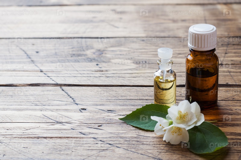 Масло жасмина. Ароматерапия с маслом жасмина. Цветы жасмина. Деревянный фон с копировальным пространством