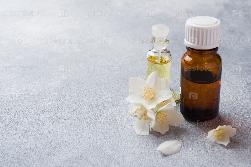 Масло жасмина. Ароматерапия с маслом жасмина. Цветы жасмина. Серый бетонный фон с копировальным пространством