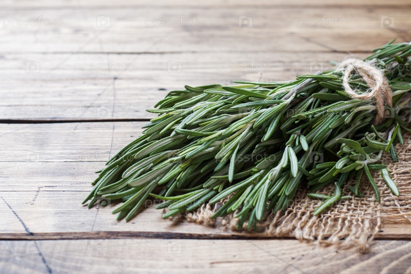 Букет свежего розмарина на деревянном фоне. Копировать пространство