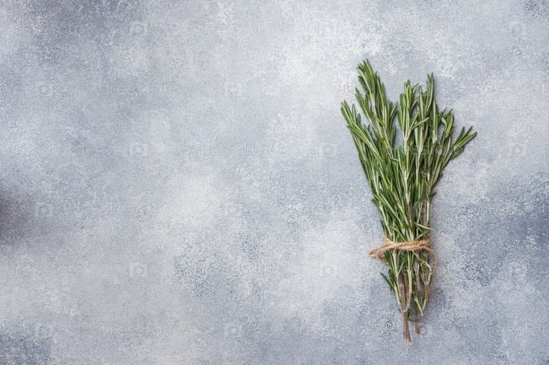 Ветки свежего розмарина на сером бетонном фоне. Копировать пространство